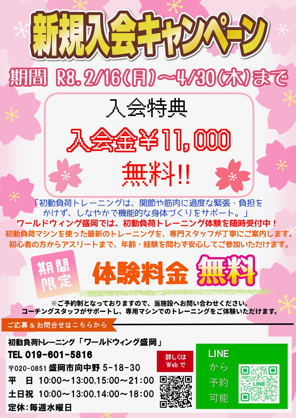 【入会金無料キャンペーン】 ニュース 2026.02.20 いつもご利用頂き、誠にありがとうございます。 入会金無料キャンペーンのご案内です。 2/16~4/30迄、入会金無料キャンペーンを行います。 キャンペーン期間中は入会金¥11,000 → 無料!! 大変お得なキャンペーンを是非ご利用下さい。 入会予約、体験予約のご連絡は当施設までお願い致します。 019-601-5816 皆様のご利用、お待ちしております。 ワールドウィング盛岡