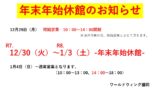 【年末年始休館日のお知らせ】 ニュース 2020.12.12 平素より当施設をご利用いただき、誠にありがとうございます。 また、新型コロナウイルス感染症対策にご理解とご協力を頂き、感謝申し上げます。 下記日程で年末年始休館とさせて頂きます。 記 年内最終営業日:12月29日(火) 10:00~14:00 (お昼休館はございません) 休館日:12月30日(水) ~1月3日(日) 1月4日(月) 10:00~ 通常営業 本年もご愛顧頂き、誠にありがとうございました。 新年もどうぞよろしくお願い致します。 ワールドウィング盛岡