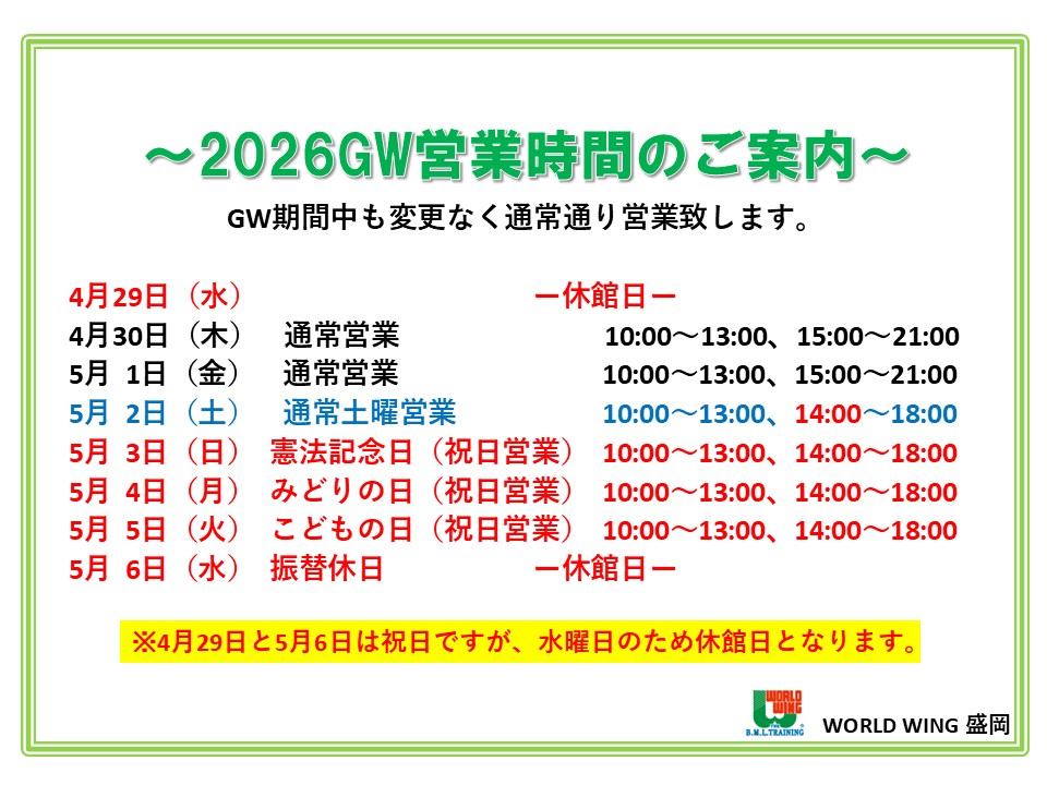 【GW営業時間のご案内】 ニュース 2026.04.13 いつもご利用頂き、誠にありがとうございます。 ゴールデンウィークは、変更なく通常通り営業致します。 祝日は、土日営業時間での営業となりますので、お間違えのないよう宜しくお願い致します。 4/29(水)、5/6(水)は水曜定休にあたりますので休館日となります。 皆様のご来館、お待ちしております。 ワールドウィング盛岡
