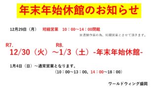 ニュース 【年末年始休館のお知らせ】 いつも当施設をご利用頂き、誠にありがとうございます。 上記の通りご案内させていただきます。 年内最終営業日:12/29(月)10:00~14:00完全閉館(お昼休館なし) 年末年始休館:12/30火(火)~1/3(... ニュース