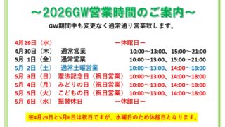 ニュース 【GW営業時間のご案内】 いつもご利用頂き、誠にありがとうございます。 ゴールデンウィークは、変更なく通常通り営業致します。 祝日は、土日営業時間での営業となりますので、お間違えのないよう宜しくお願い致します。 4/29(水)、5/6(水)は水曜定休に... ニュース